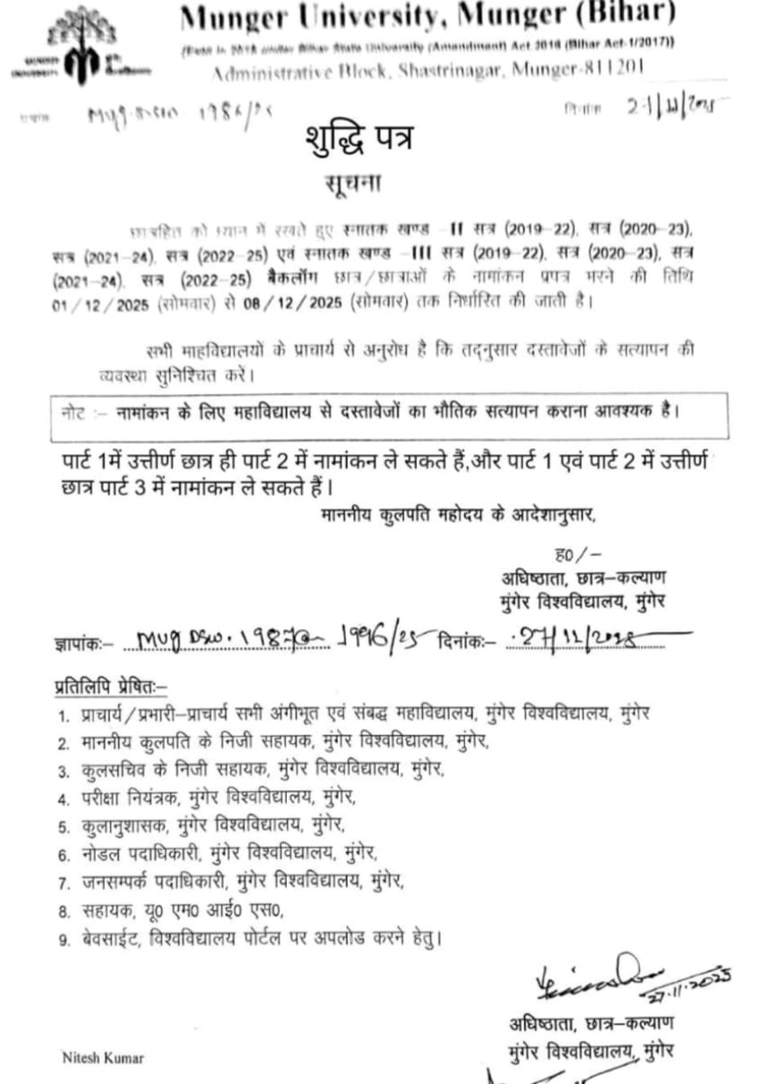 Corrigendum Examination Center of UG Part - III Session - 2022-25, Examination - 2025
